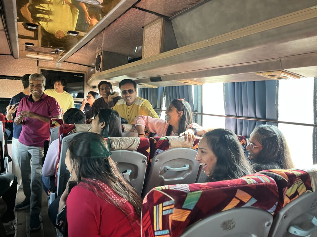 The bus was unofficially divided into two halves: Team Front vs. Team Back. Soon, it turned into Old Classics vs. Gen Z Anthems. From Kishore Kumar melodies to the latest chartbusters, we sang, argued over lyrics, teased one another, and laughed like the outcome truly mattered. The energy was infectious. Just when the game was reaching its dramatic peak, we arrived.